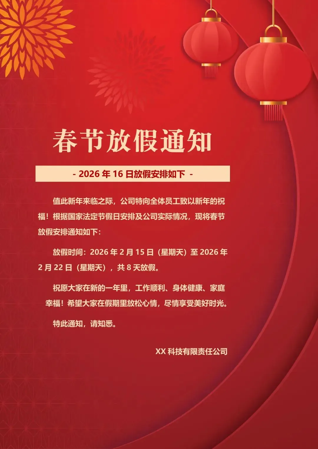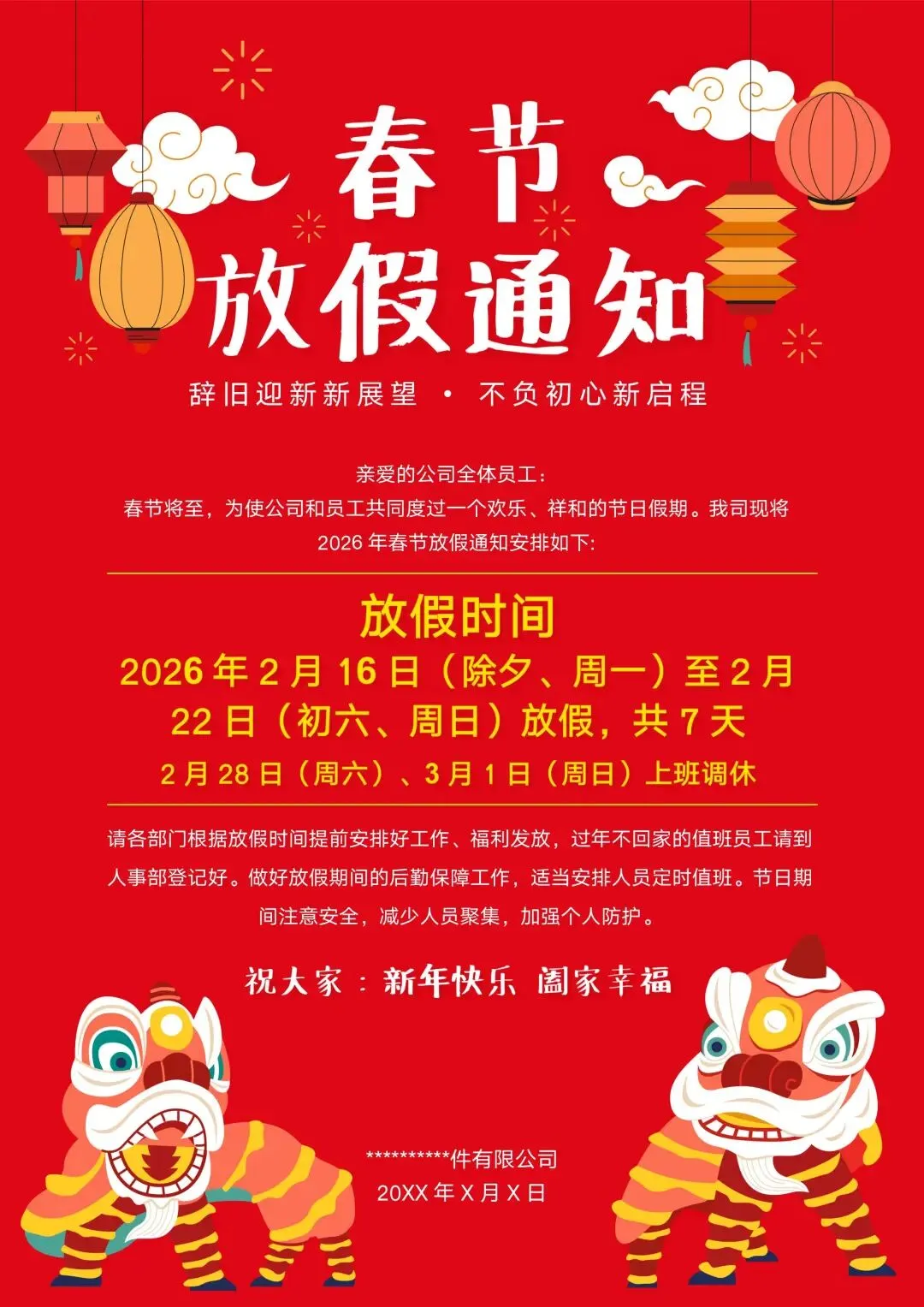 100+套2026马年春节放假通知word模板可编辑打印免费领取2026 马年春节将至,还在为撰写放假通知发愁?别担心,小编特意准备了 Word 可编辑的 2026 马年春节放假通知模板 ,简单修改就能用,帮你轻松搞定通知事宜,快速传达放假安排。