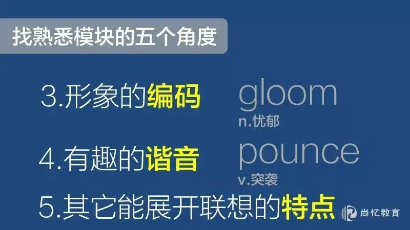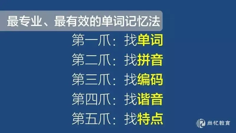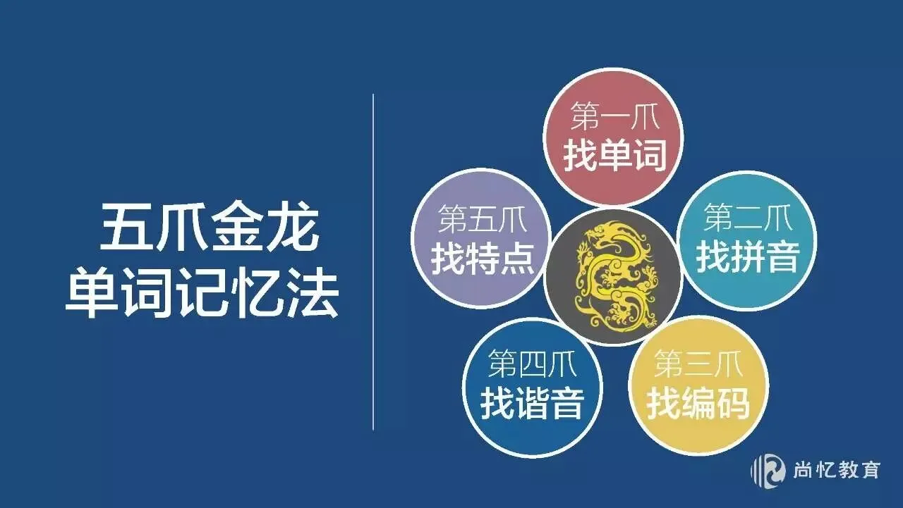 联想只要勤于做就是没有问题的,那么怎么找到熟悉的模块呢,这就要发挥我们的“五爪”啦,“五爪”就是“五找”,分别是找单词、找拼音、找编码、找谐音、找特点。通过这五个维度的找模块,再加上丰富的联想就能轻松的搞定英语单词啦!