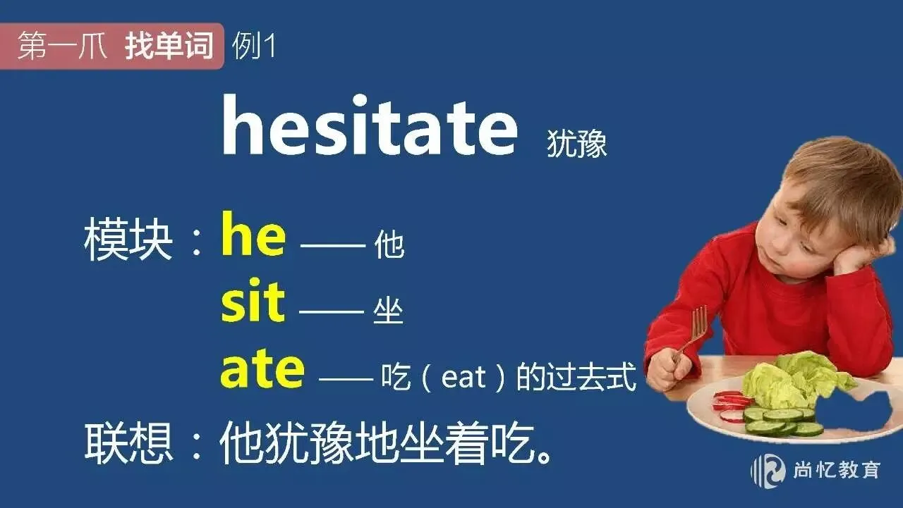 · 第一爪: 比如要记忆这个单词hesitate(犹豫),我们使用“熟词法”,可以把单词分解为he和sit以及ate三个模块,然后进行联想:他犹豫地坐着吃。