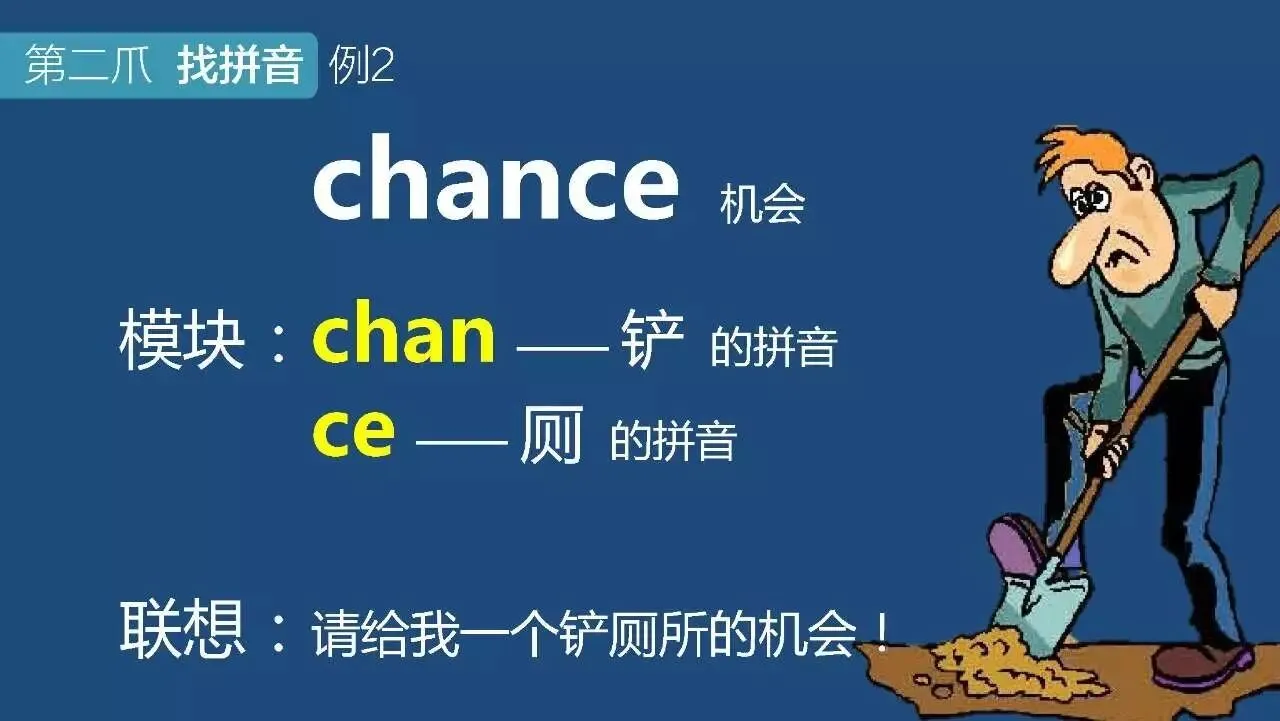 · 第二爪: 比如要记忆这个单词chance(机会),我们使“找拼音”,可以把单词分解为chan和ce两个模块,然后进行联想:请给我一个铲厕所的机会!
