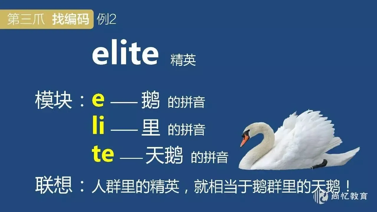 · 第三爪: 比如要记忆这个单词elite(精英),我们使“找编码”,可以把单词分解为e和li以及te三个模块,然后进行联想:人群里的精英,就相当于鹅群里的天鹅。