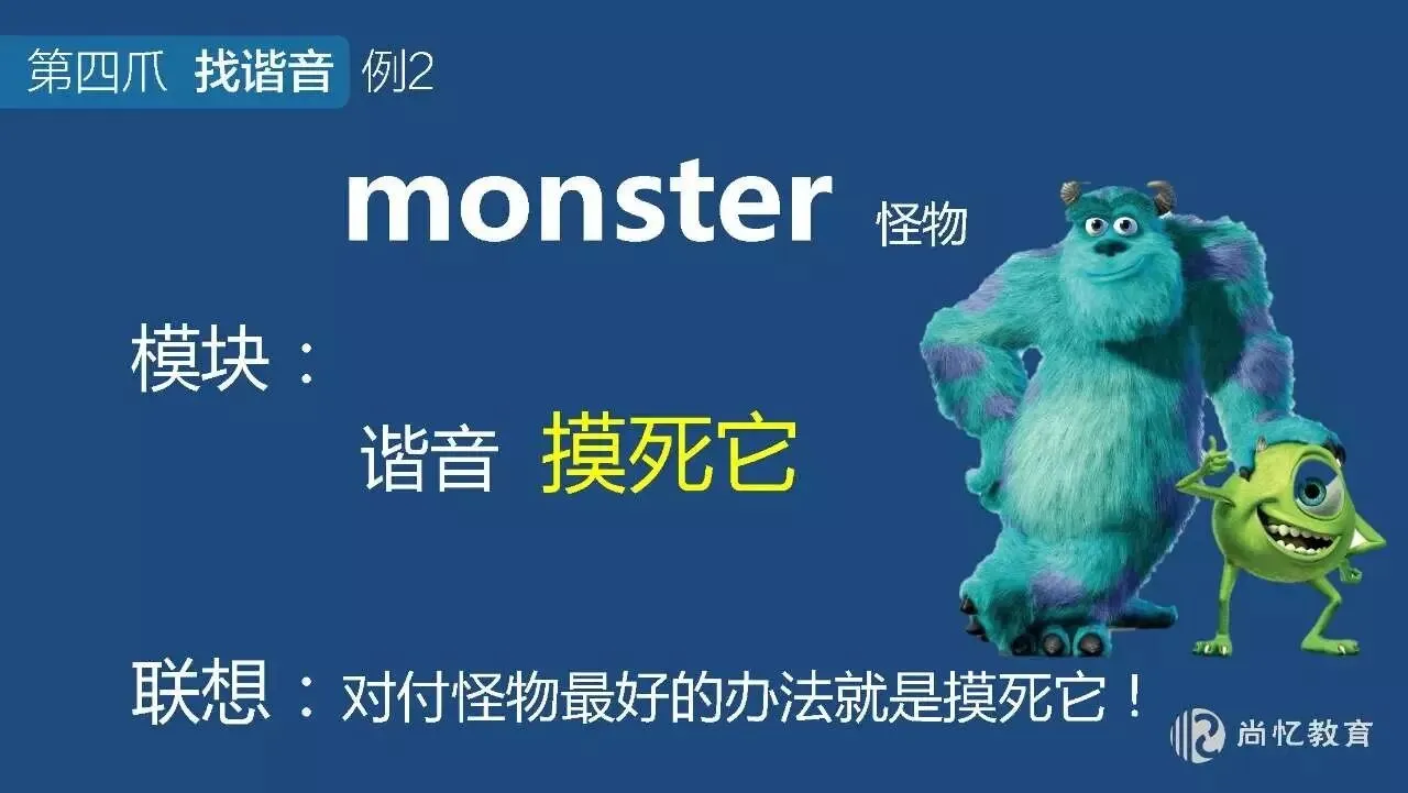 · 第四爪: 比如要记忆这个单词monster(怪物),我们使“找谐音”,可以把单词直接谐音化:摸死它,然后进行联想:对付怪物最好的方法就是摸死它!