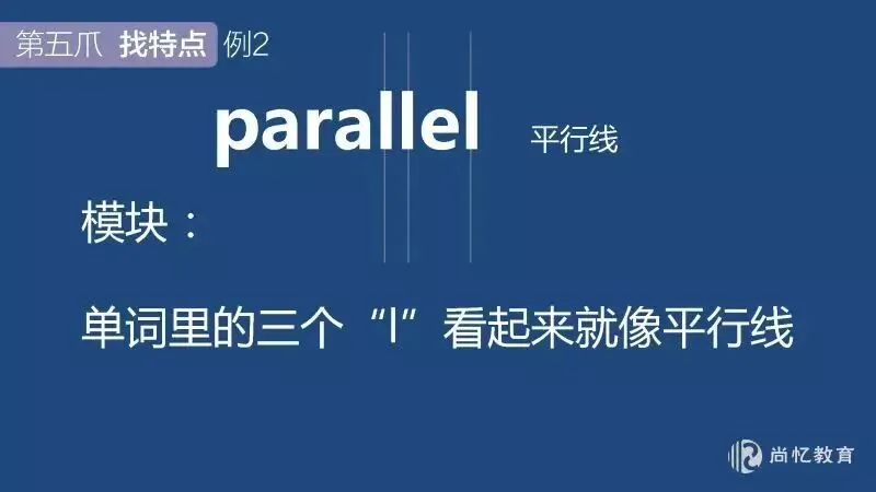 · 第五爪: 比如要记忆这个单词parallel(平行线),我们使“找特点”,单词里的三个“l”看起来就像平行线。