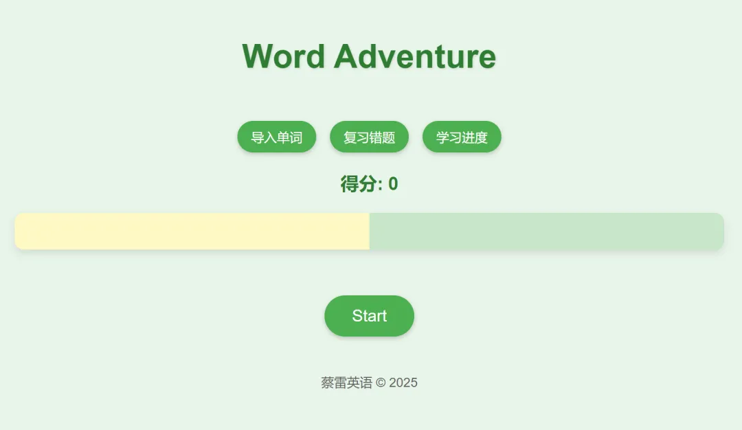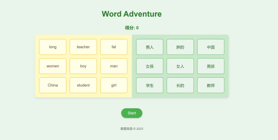 请设计标题为Word Adventure词汇学习游戏,标题上方居中,页面背景清新风格。页面布局左右均分,左边英文单词9个,右侧乱序中文意思。单词列表为:China、teacher、student、boy、girl、women、man、long、fat