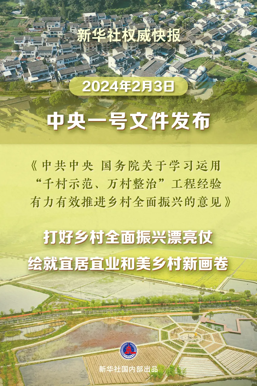 2024年中央一号文件公布 提出推进乡村全面振兴“路线图”党的十八大以来第12个指导“三农”工作的中央一号文件3日由新华社受权发布,提出有力有效推进乡村全面振兴“路线图”。这份文件题为《中共中央 国务院关于学习运用“千村示范、万村整治”工程经验有力有效推进乡村全面振兴的意见》,全文共六个部分,包括:确保国家粮食安全、确保不发生规模性返贫、提升乡村产业发展水平、提升乡村建设水平、提升乡村治理水平、加强党对“三农”工作的全面领导。文件指出,推进中国式现代化,必须坚持不懈夯实农业基础,推进乡村全面振兴。要学习运用“千万工程”蕴含的发展理念、工作方法和推进机制,把推进乡村全面振兴作为新时代新征程“三农”工作的总抓手,坚持以人民为中心的发展思想,完整、准确、全面贯彻新发展理念,因地制宜、分类施策,循序渐进、久久为功,集中力量抓好办成一批群众可感可及的实事,不断取得实质性进展、阶段性成果。文件提出,以确保国家粮食安全、确保不发生规模性返贫为底线,以提升乡村产业发展水平、提升乡村建设水平、提升乡村治理水平为重点,强化科技和改革双轮驱动,强化农民增收举措,打好乡村全面振兴漂亮仗,绘就宜居宜业和美乡村新画卷,以加快农业农村现代化更好推进中国式现代化建设。中央农村工作领导小组办公室有关负责人表示,要全面贯彻落实党的二十大和二十届二中全会精神,深入贯彻落实习近平总书记关于“三农”工作的重要论述,锚定建设农业强国目标,真抓实干做好2024年重点工作,不折不扣完成好既定目标任务,推动乡村全面振兴不断取得新进展。