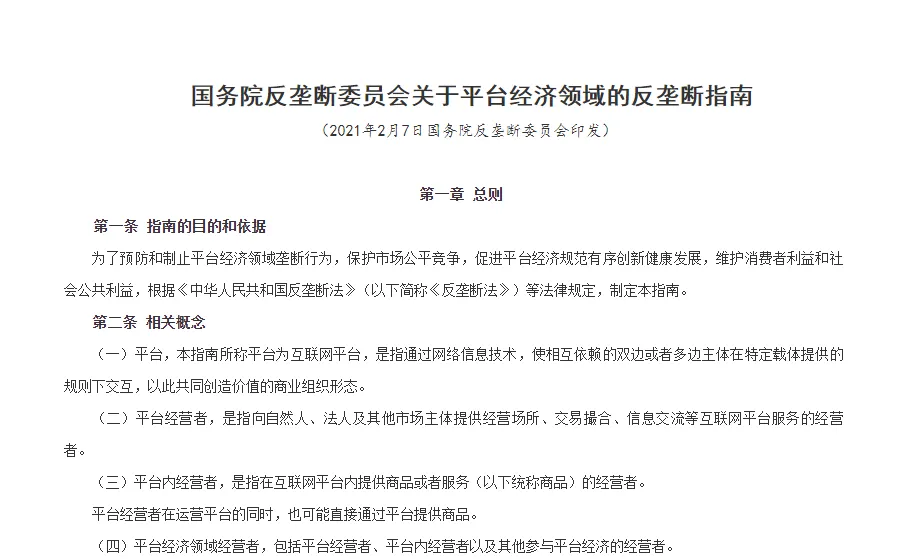 国家市场监督管理总局2月7日消息,为贯彻落实党中央、国务院决策部署,加强平台经济领域反垄断监管,完善监管规则,引导平台经济领域经营者依法合规经营,促进平台经济规范有序创新健康发展,在总结我国执法实践经验和借鉴其他国家(地区)做法的基础上,根据《反垄断法》等有关法律规定,国务院反垄断委员会(以下简称委员会)制定出台《国务院反垄断委员会关于平台经济领域的反垄断指南》(以下简称《指南》)。