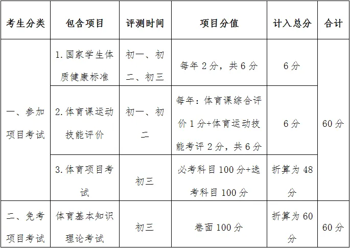 2021年中考体育包括《国家学生体质健康标准》(下称《国标》)、体育课运动技能评价(下称《体评》)和体育项目考试共三部分。因残疾或身体原因不适合参加项目考试的学生,可按相关程序申请免考项目考试,符合条件的学生予以安排参加体育基本知识理论考试。
