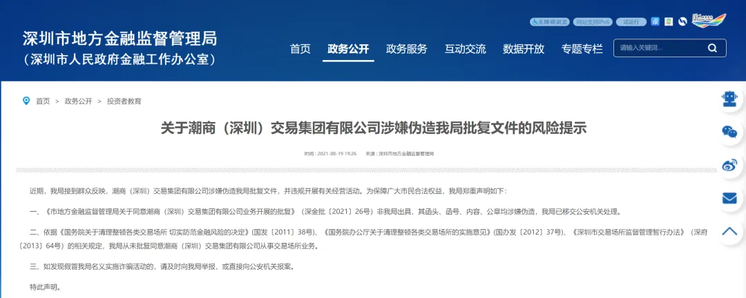 惊现山寨交易所?涉嫌伪造批复文件!已移交公安机关处理…近日,深圳市地方金融监督管理局官网发布风险提示,称近期接到群众反映,潮商(深圳)交易集团有限公司涉嫌伪造该局批复文件,并违规开展有关经营活动。深圳金融局指出,《市地方金融监督管理局关于同意潮商(深圳)交易集团有限公司业务开展的批复》(深金批〔2021〕26号)非深圳金融局出具,其函头、函号、内容、公章均涉嫌伪造,深圳金融局已移交公安机关处理。△来源:深圳市地方金融监督管理局函头、函号、内容、公章均涉嫌伪造日前,深圳金融局发布一则潮商(深圳)交易集团有限公司涉嫌伪造批复文件的风险提示。深圳金融局表示,近期接到群众反映,潮商(深圳)交易集团有限公司涉嫌伪造深圳金融局批复文件,并违规开展有关经营活动。深圳金融局对此郑重声明,《市地方金融监督管理局关于同意潮商(深圳)交易集团有限公司业务开展的批复》(深金批〔2021〕26号)非金融局出具,其函头、函号、内容、公章均涉嫌伪造,金融局已移交公安机关处理。依据相关规定,深圳金融局从未批复同意潮商(深圳)交易集团有限公司从事交易场所业务。同时,深圳金融局还提醒,如发现假冒金融局名义实施诈骗活动的,及时向金融局举报,或直接向公安机关报案。工商资料显示,潮商(深圳)交易集团成立于2018年,位于深圳市南山区,法定代表人为刘某丽,注册资本4980万元人民币,主要承接国有资产、权益产品、实物资产、股权、收益权等相关各种产品转让登记、托管、结算、资产转让、资产交易。据悉,在官方风险提示发布后,目前该公司官网已经无法打开。持续加大清理整顿和监管力度2013年,深圳市发布《深圳市交易场所监督管理暂行办法》,进一步加大对各类交易场所的监督管理。近年来,国家和地方均持续加大清理整顿力度。2020年12月,证监会通报清理整顿各类交易场所部际联席会议第五次会议内容及工作部署。会议指出,严控交易场所数量始终是清理整顿工作的重点之一。会议要求,对于情节严重、危害较大的违法犯罪活动要重拳打击,以打促整,以打促稳,维护市场秩序,保护投资者合法权益。今年4月7日,广东省人民政府办公厅发布《广东省交易场所监督管理办法》,对广东省内交易场所的设立、变更、终止和规范运营等行为进行规范,要求在全省清理整顿各类交易场所工作完成前,原则上不新设立交易场所,交易场所原则上不得设立分支机构。进一步加强清理整顿和监管力度,促进交易场所健康有序发展。转载请注明“央视财经”你会关注紧急寻人!途经河北,这趟列车同行人员注意→水电、食品、汽油…这里物价“涨”声一片!却意外带火千亿市场,各大零售企业纷纷布局…解封!降级!零新增!喀布尔物价飙升!一袋面粉价格竟高达150元...全国首个破产信息公开公示机制来了!来源:央视交易时间综合中国证券报监制:柯成韵本文编辑:张艺菲 持续关注!↓ ↓ ↓