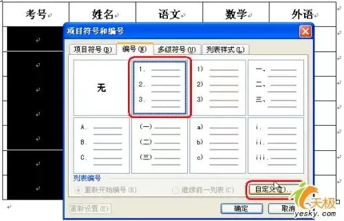 1、在一个成绩表的“考号”这列中准备填入考号6101、6102、6103……6144、6145,其中61代表班级,后边两位是学生顺序号。这时我们可以选中“考号”这列下边所有的单元格,单击“格式”→“项目符号和编号”, 在“项目符号和编号”对话框中选择“编号”选项卡,随便选择一种编号方式,然后点“自定义”按钮。(如图3)