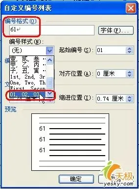 2、在“自定义编号列表”对话框中的“编号格式”框内把显示的原编号删除,然后输入“61”这两个数字,再到“编号样式”列表框中选择“01,02,03”样式,最后点“确定”退出。就会按照从上到下(或从左到右)的顺序从6101开始自动填充考号了。(如图4)