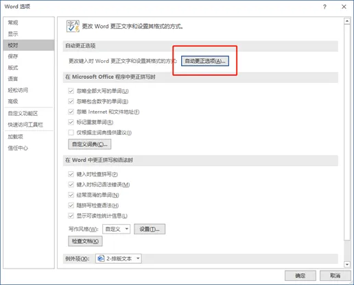 按“文件->选项->校对”的顺序打开如图1-2窗口,再点击“自动更正选项”,然后点击图1-3中的“键入时自动套用格式”,最后关闭“自动编号列表”。