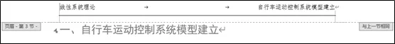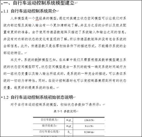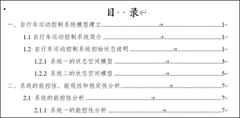 前述内容中已经给出了如何设置各级标题的方式,例如一、自行车运动控制系统模型建立,1.1自行车运动控制系统简介,1.2.1系统一的状态空间模型分别就是一级标题、二级标题和三级标题。要生成目录的话,绝对不是那么头铁地一个字一个字地手打目录,手动计算每级标题的目录位置,这样的勇士我在现实里见到过一位,当时就被他惊为天人的操作震惊了。