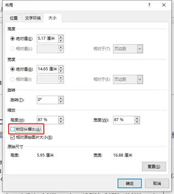 首先,选中图片,在选项卡上会出现如图3-6所示的“格式”,点击格式,图3-7右边的“大小”即能实现调整图片大小的功能,此时图片大小的纵横比是锁定的,图片长度发生变化,其宽度亦随之而变。若只欲改变长、宽中某一项,可点击橙框的展开,如图3-8所示,取消复选框的“锁定纵横比”选项即可。