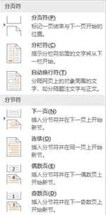 点开分隔符之后,出来如图3-25所示的菜单,分为分节符和分页符两个大类。常用的有三种分隔符,分页符中的分页符,分节符中的下一页和连续。分页符的作用很简单,插入分页符之后,文字内容被分隔开了,分页符之后的内容转至下一页第一行开始。分节符中的下一页与分页符的作用相似,不过分节符之前与分节符之后的内容属于两节。而分解符中的连续符号,则不会让文字转至下一页,符号前后的文字内容仍在同一页,只不过所属节不一样了。