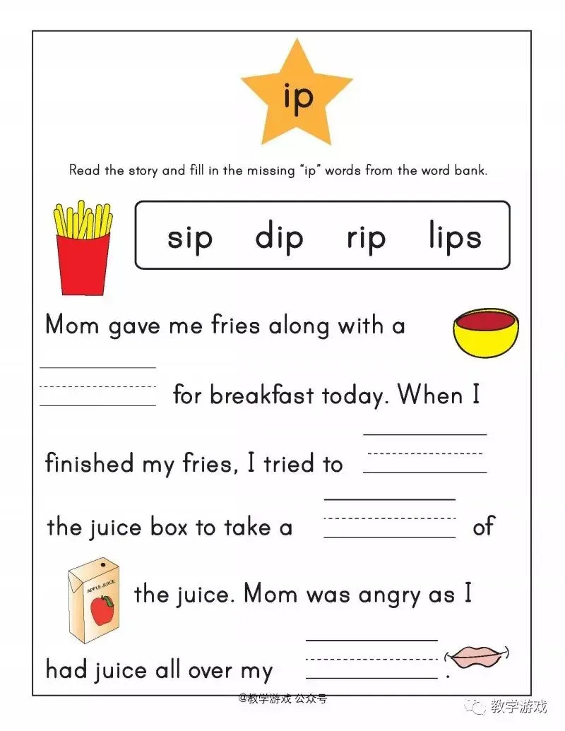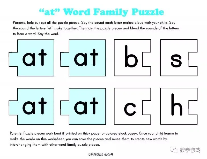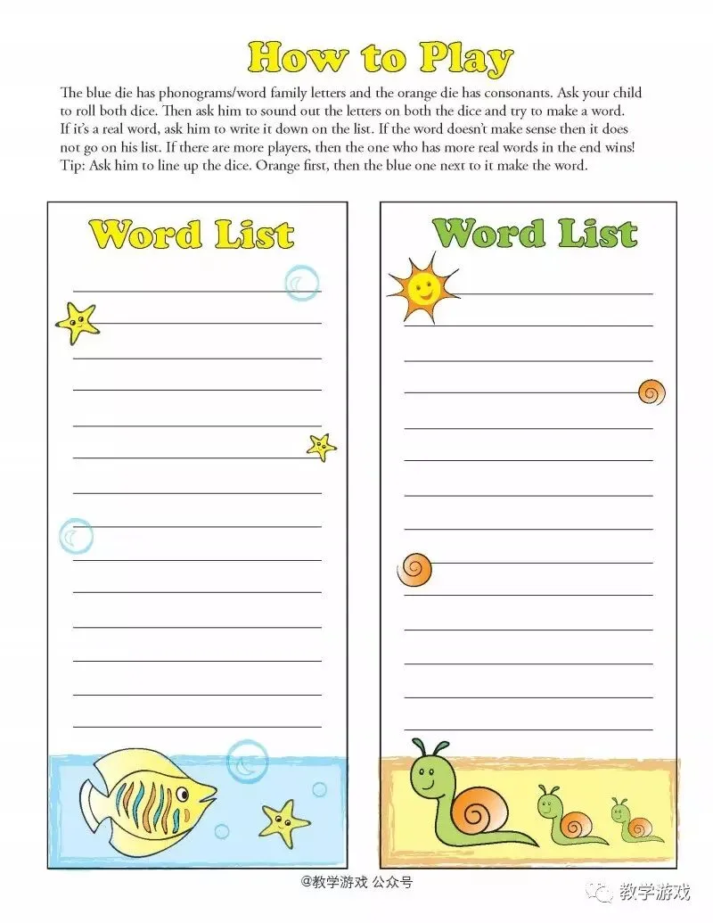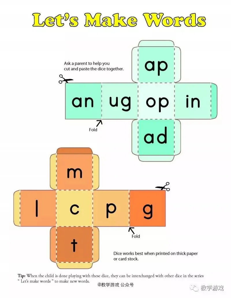 还可以自己动手打印制作word family 骰子 橙色骰子是辅音,蓝色骰子是原音加辅音,让孩子同时扔两个骰子,橙色在前,蓝色在后。读出单词,如果是一个正确的词,可以写在后面表格上,谁写得多获胜欧!