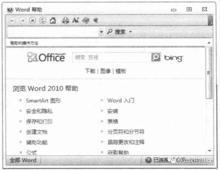 (1) 在Word界面中按下<F1>键或单击Word 2010程序界面右上角 “?” 后就可以调出"Word帮助”任务窗格,在搜索”文本框中输入关键词,在窗口中输入关键词进行搜索,一条或多条搜索结果就会提供给读者来选择,如图1-1所示。