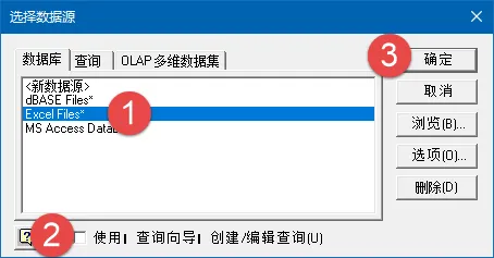 (下面的截图是2019,其它版本的位置可能略有不同,都是在【数据】选项卡下,可以找找看)在【选择数据源】对话框中选择“Excel Files*”,去掉底部查询向导的勾勾,单击【确定】。