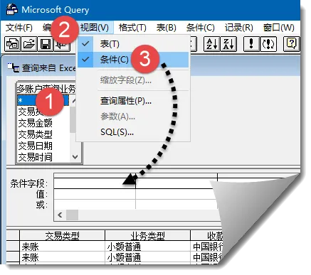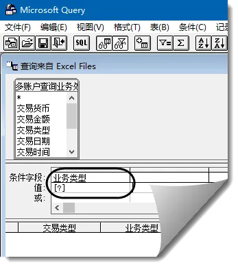 然后依次单击【视图】→【条件】命令,显示出条件输入的界面。单击【条件字段】右侧的下拉按钮,选择查询的字段,例如“业务类型”。此时如果弹出【输入参数值】的对话框,可以直接将其关闭。依次单击【文件】→【将数据返回Microsoft Excel】。