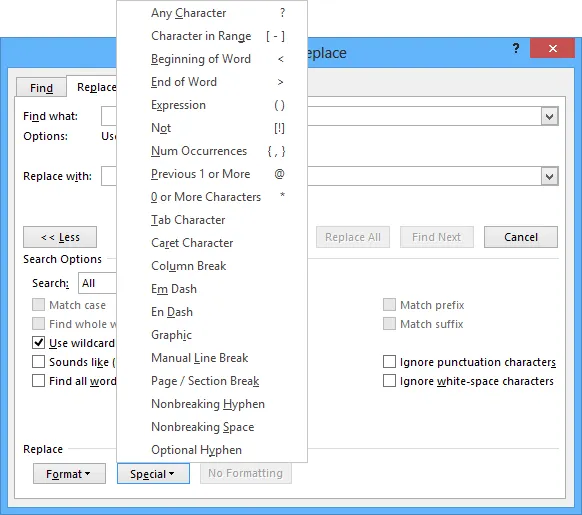在“特殊”弹出菜单上,单击通配符,然后在“查找内容”框中键入任何附加文字;