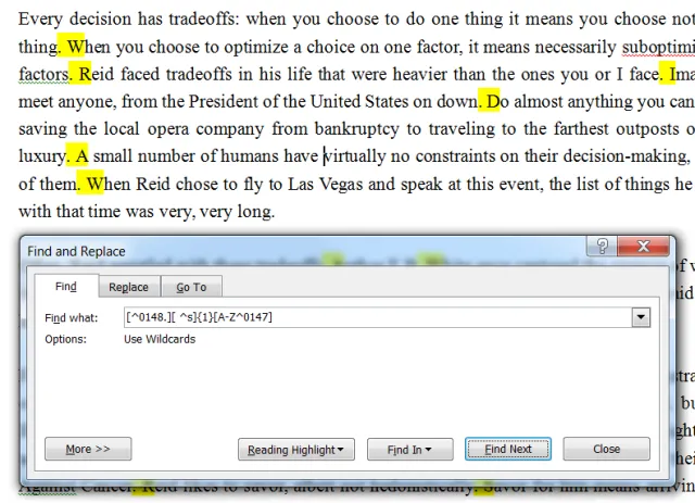 比如,找所有句子与句子之间只有一个空格的地方(两个空格为正常)。