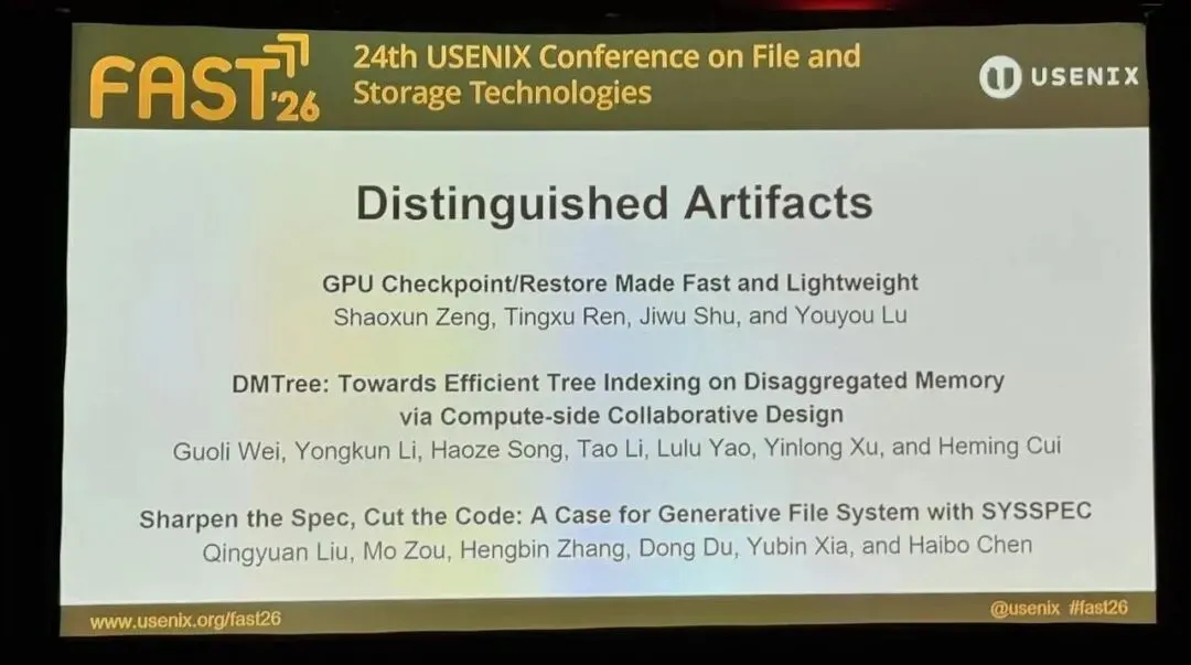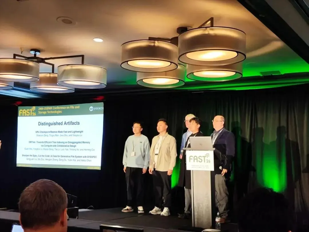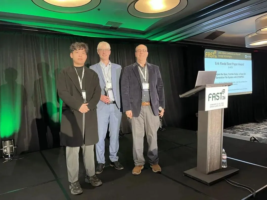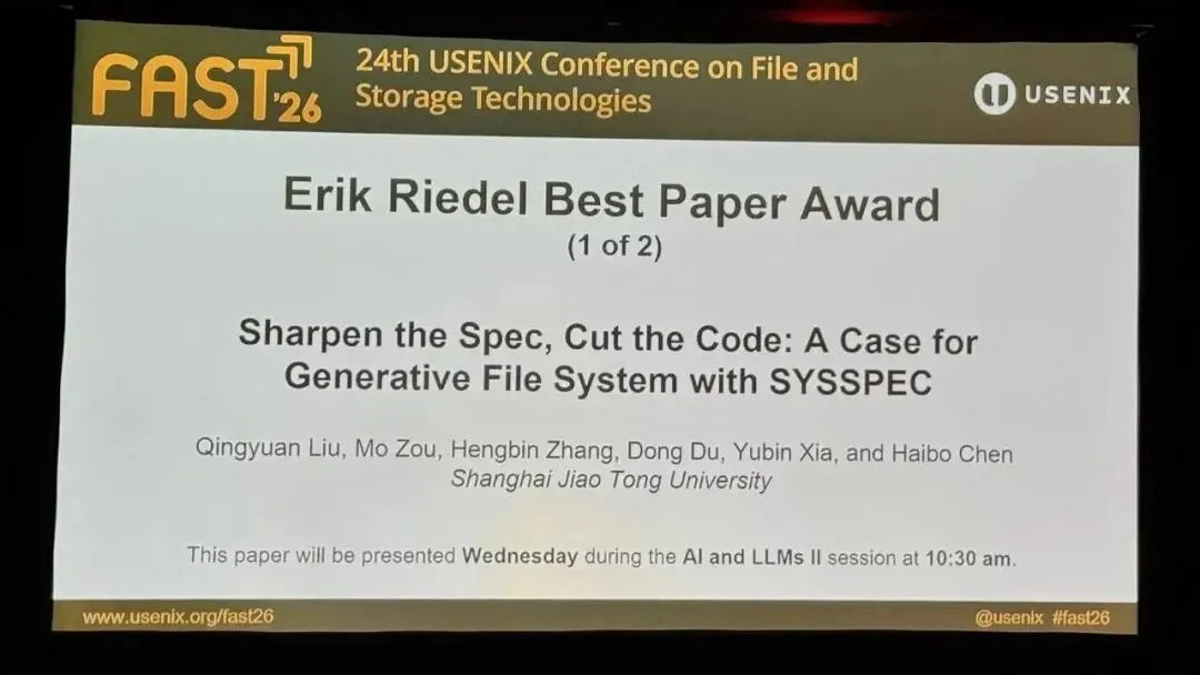 在2026年2月24-26日于美国加州Santa Clara召开的第24届USENIX文件与存储技术会议 (USENIX FAST'26)上,上海交通大学计算机学院并行与分布式系统研究所(IPADS)的一项关于生成式文件系统的研究(Sharpen the Spec, Cut the Code: A Case for Generative File System with SYSSPEC),从全球众多顶尖成果中脱颖而出,同时获得了“Erik Riedel最佳论文奖”(Erik Riedel Best Paper Award)以及“杰出技术成果奖”(Distinguished Artifact Award)。这篇论文也成为了USENIX FAST自2002年创办以来,历史首次同时获得最佳论文奖和杰出技术成果奖的论文。