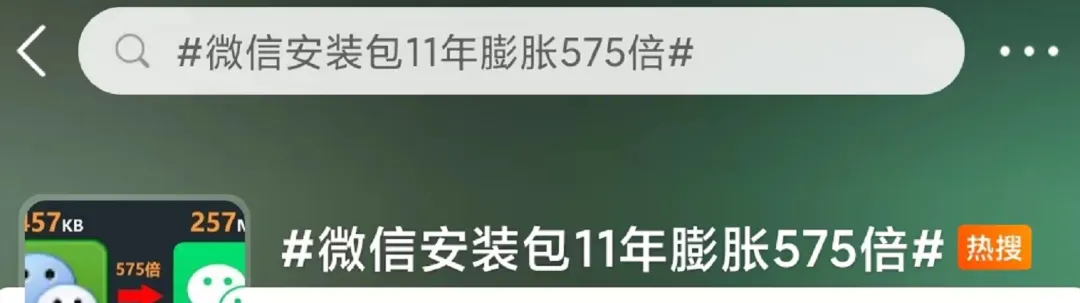 如今,在社交平台上,也经常能看到消费者对手机内存不够用的吐槽。许多手机APP在更新迭代中也发生了数倍的膨胀,此前,#微信安装包11年膨胀575倍#登上热搜,引发不少网友的讨论。