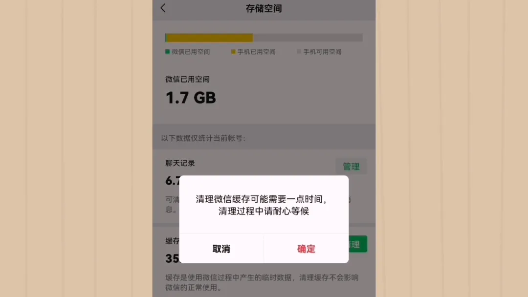 在一个微信聊天记录中,点击最右边的管理,可以选中不需要的一些聊天记录。然后点击右下角的删除按钮。最后点击删除,点击确定,返回一下,微信就能释放内存了。