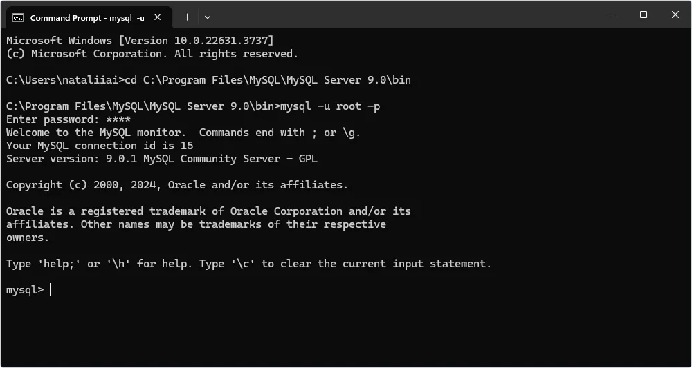 成功连接后,显示 mysql>提示符,输入以下命令测试: