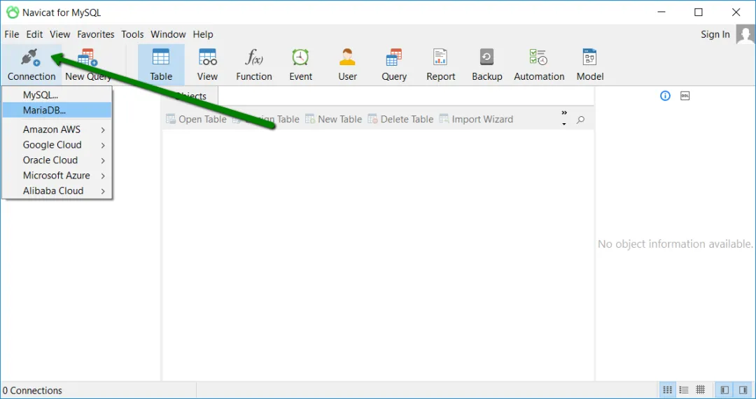 打开 Navicat,点击 "连接" → **"MySQL"**。