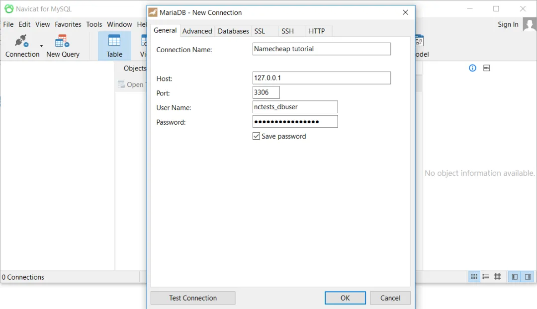点击 "Store in Keychain" 保存密码,输入 root 密码。 点击 "Test Connection" 测试连接,显示 "Successfully made the MySQL connection" 即成功。