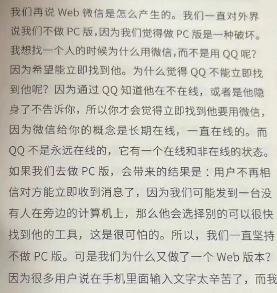 微信电脑版必须手机扫码才能登录的原因,腾讯副总裁给出了答案点击上方蓝色字体,关注我们众所周知,微信是一个手机端的社交聊天app,从2011年发布面世,到如今拥有十几亿的用户的微信,至今都没有推出PC版,不少人认为如今扫码登录的微信就是PC版的微信,但实际上那只是一个Web版本,其定位是连接键盘,方便用户在使用电脑的时候输入文字沟通,而不是真正的PC版微信,这也是为什么微信一定要用手机才能扫码登录的一个原因,因为Web版本只是服务于手机端的微信,并不是真正的应用。而其实在最早的时候,腾讯却是连Web的界面都不想做,只是因为不少用户反馈日常的工作交流等都多在在电脑上,而微信只有手机端,既要顾着电脑,又要看着手机,实在太不方便,麻烦得很。腾讯这才想着做一个能让用户在电脑端也能使用微信的界面。但腾讯想做的功能仅仅是连接PC键盘,打出来的字,依旧只显示在手机端。但如果真的做成这样的模式,试想一下我们使用微信的场景却是有些滑稽:一边要架着手机,一边放着电脑,在键盘上打字的时候,打出来的文字对错、矫正、浏览等都要看着小小的手机屏幕。对于那些原本提出诉求的用户,可以说不仅没有“雪中送炭”,反而“雪上加霜”。还好,腾讯的团队还没有丧失理智,最终还是否决了这个想法,但他们做出的如今这个版本的Web版微信,还是受到了不少人的吐槽,就拿电脑端一定要手机扫码登录这个点,就让很多人觉得“心累”,在很多的情况下,不就是手机登不了微信,或者手机不在身旁的情况下才想着用电脑端微信,结果打开电脑点开微信,就让你扫码登录,没有一点点防备,没有一点点商量的余地,要么扫码登录,要么别想登陆。可即便Web版微信有那么多吐槽争议,微信团队始终坚持着这样的模式不曾更改,究其根本,其实是微信这个产品自孵化阶段的就确立的理念。腾讯副总裁张小龙在《微信背后的产品观》一书中写到:微信要做的是一个长期在线的,一直在线的社交软件,通过微信可以立即找到一个人并确保他能够接收、看到到你的消息。这就是为什么微信没有PC端的原因,因为它要防止用户的信息发送到一台无人坐理的计算机面前!而这个理念,也在一定程度上将微信与QQ区分开来,很多人不明白微信和QQ的区别,但其实从微信和QQ的产品理念设计开始二者就是不同的,QQ可以隐身,可以不在线,但微信并没有这种告知他人在不在线,我可能会收不到你消息的功能设计,也没有钉钉这类办公软件的已读未读功能,微信给人的感觉,就是时时刻刻在线,让用户觉得通过微信是可以找到那个人,并且他一定会看到自己的消息的。事实上,微信的确做到了,现在有人说不看微信信息,想来都没人信。如今的微信早就做到了中国社交App的龙头位置,这与它推出时定位明确,把握市场,贯彻理念有很大的关系,但微信作为一个国民级的社交软件,对于其软件功能和用户体验就更要与时俱进,如何让微信更加完善,提升用户的体验感,想必未来腾讯还有很长的一段路要走。—— 推荐阅读 ——(商务合作请联系:lin.chen@office.feng.com) 你有「在看」吗 ?