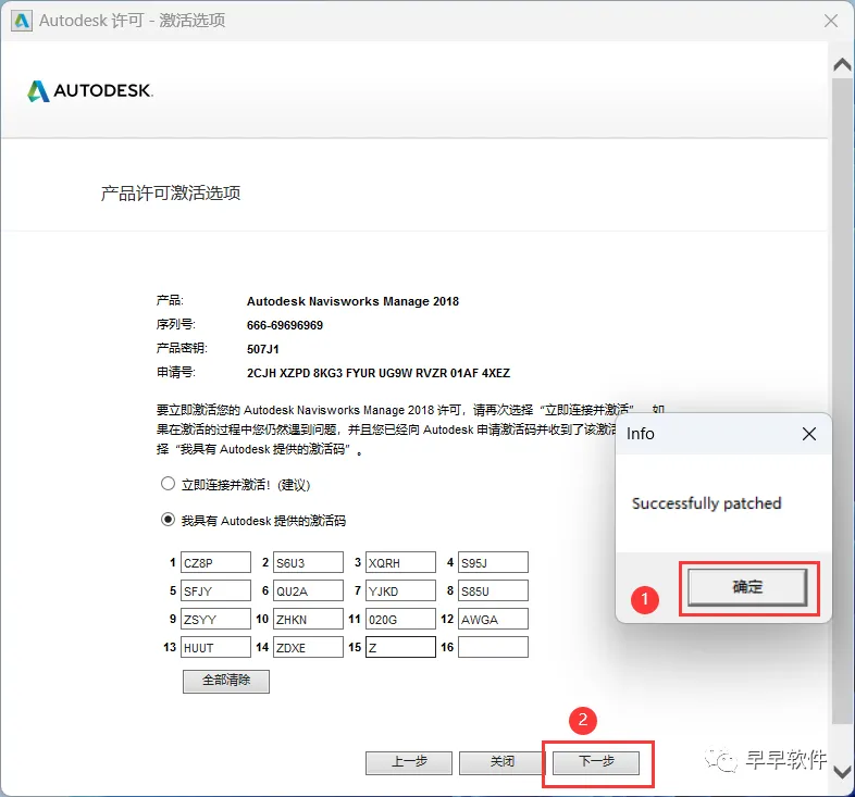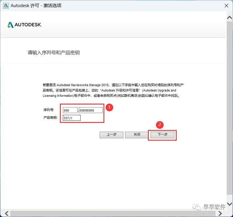 17、序列号输入:666-69696969,产品密钥输入:507J1,再点击【下一步】