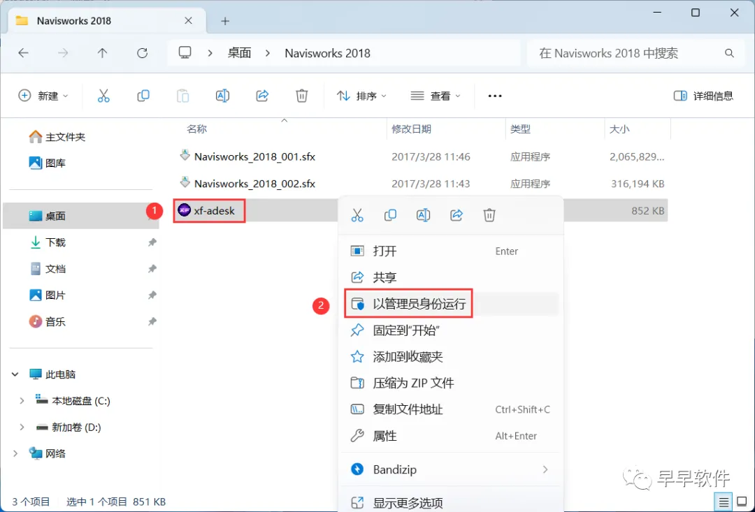 19、回到Navisworks 2018文件夹,找到【xf-adesk】程序,右键选择【以管理员身份运行】它