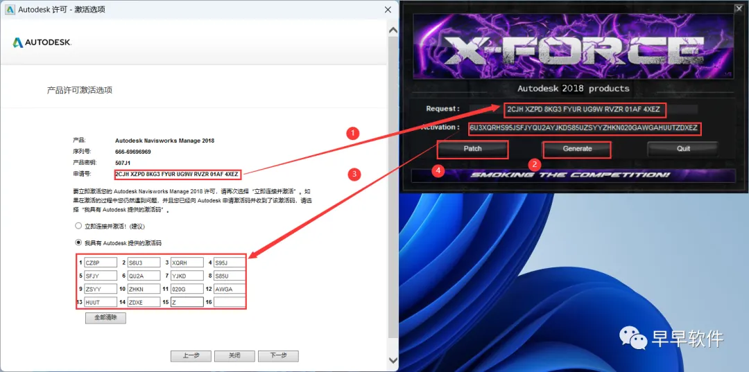 20、打开软件界面,将软件的【申请号】填入到程序的【Requset】内,再点击【Generate】,将程序的【Activation】填入到软件的【激活码】内,再点击【Patch】