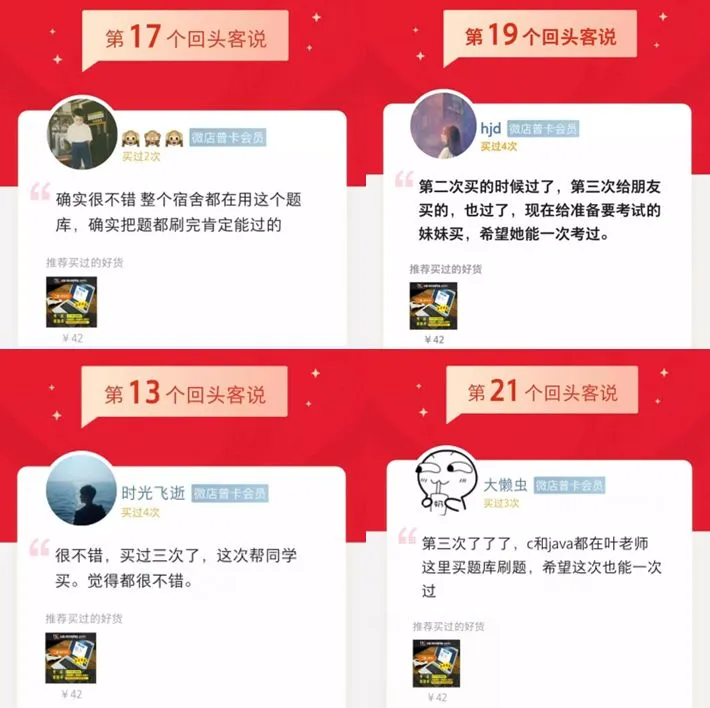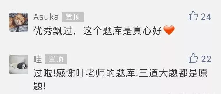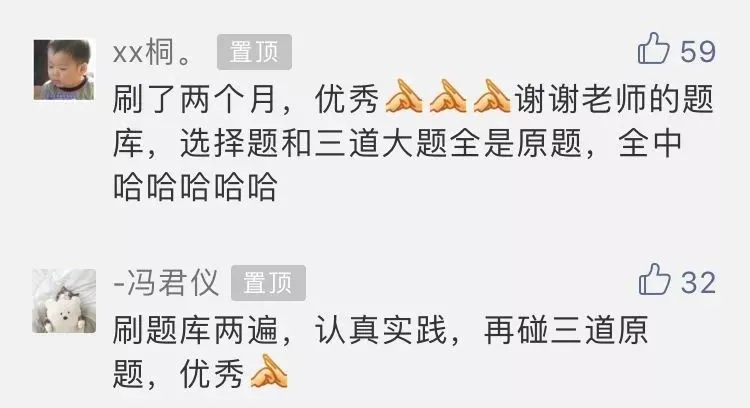题库获得了多届考生的高度认可!很多购买我们题库的考生都是经过师兄师姐推荐过来的,因为靠谱、放心!回头客精选评价和考后留言如下图: