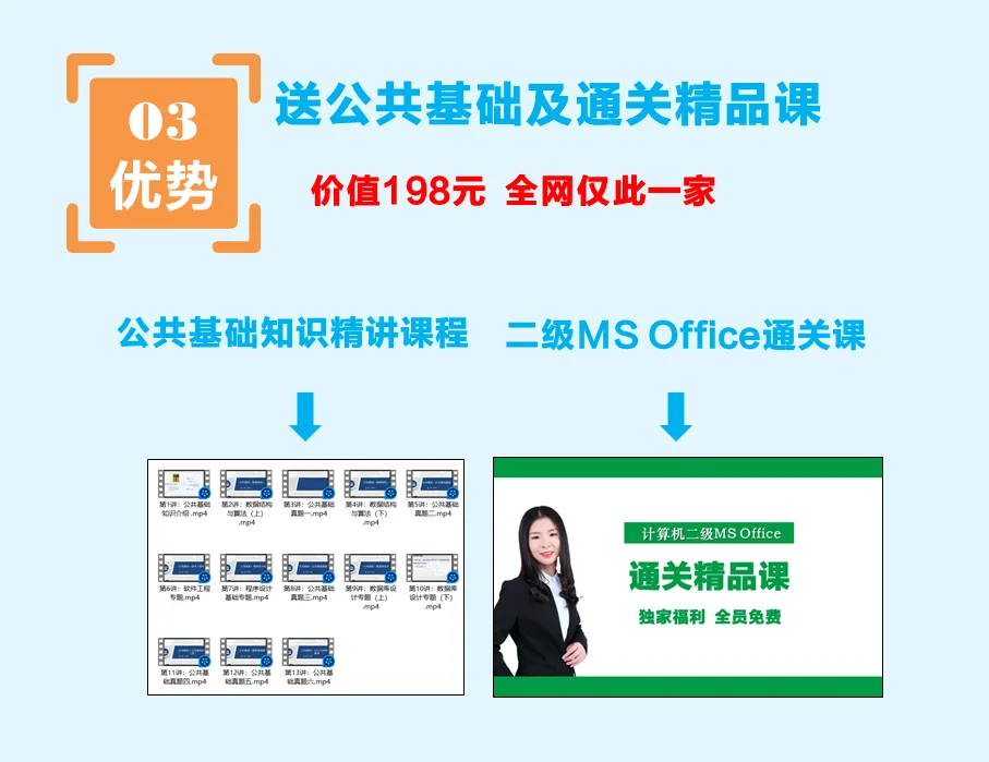 2、贴心建议:题库建议尽早买,正常备考时间要2-3个月,早买早刷题,早刷能早通过。特别是二级MS Office的考生,我们送的通关课程目前一共有166个知识点精讲视频,你听课和刷题都需要时间,为了你能一次性通过考试,请预留更多时间备考。