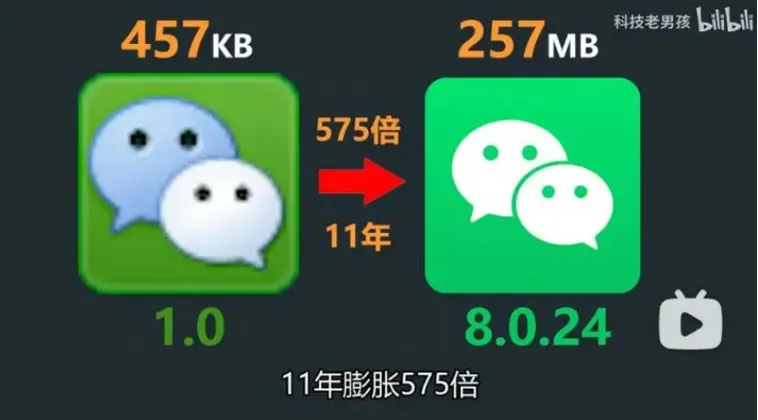 APP功能的增大犹如大规模的竞赛,唯恐落后别人半步。这样带来的结果就是,还没等到用户觉得爽,就先让手机内存增大了。比如微信安装包,用11年时间增大了570多倍!