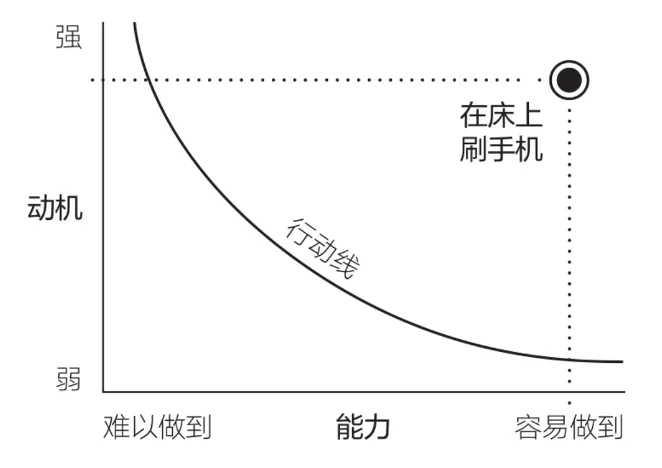 比如躺在床上刷手机这件事,动机足够强,又相当容易做到,所以很容易处于行动线之上,大部分人只要各种手机提示音一响,必然拿起来看,而且停不下来。