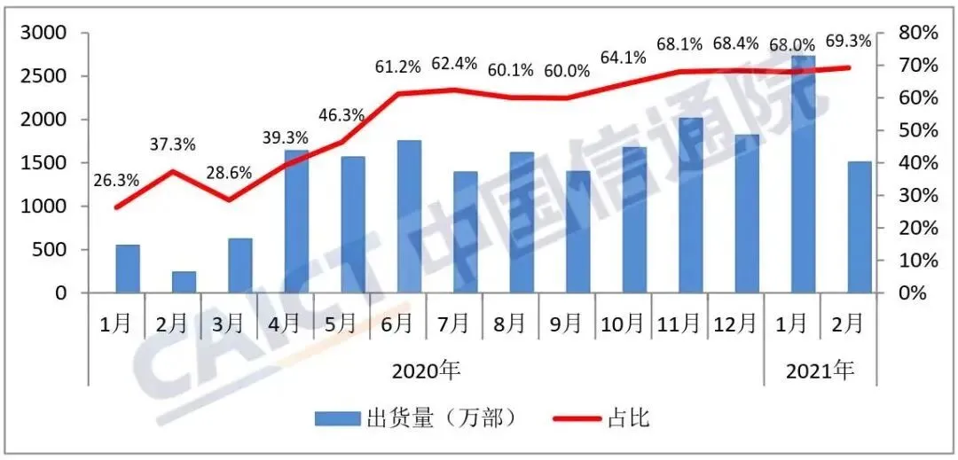 今日上午,中国信通院发布了 2021 年 2 月国内手机市场运行分析报告。报告称,2 月国内市场 5G 手机出货量 1507 万部,占比升至近七成。