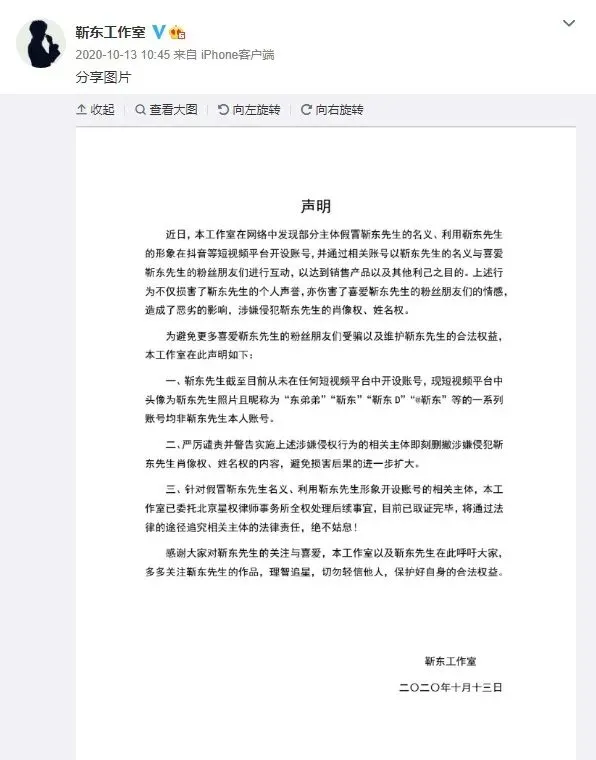 靳东工作室对此回应称,假冒账号涉嫌侵权,所有“靳东”系列账号均非本人,这些假冒账号涉嫌侵犯靳东先生肖像权、姓名权,严厉谴责并警告这种行为,目前已取证完毕,将依法追责。