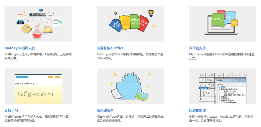 MathType支持在任何文字处理软件、演示程序、页面程序、HTML编辑工具及其它类型的软件,用来建立公式