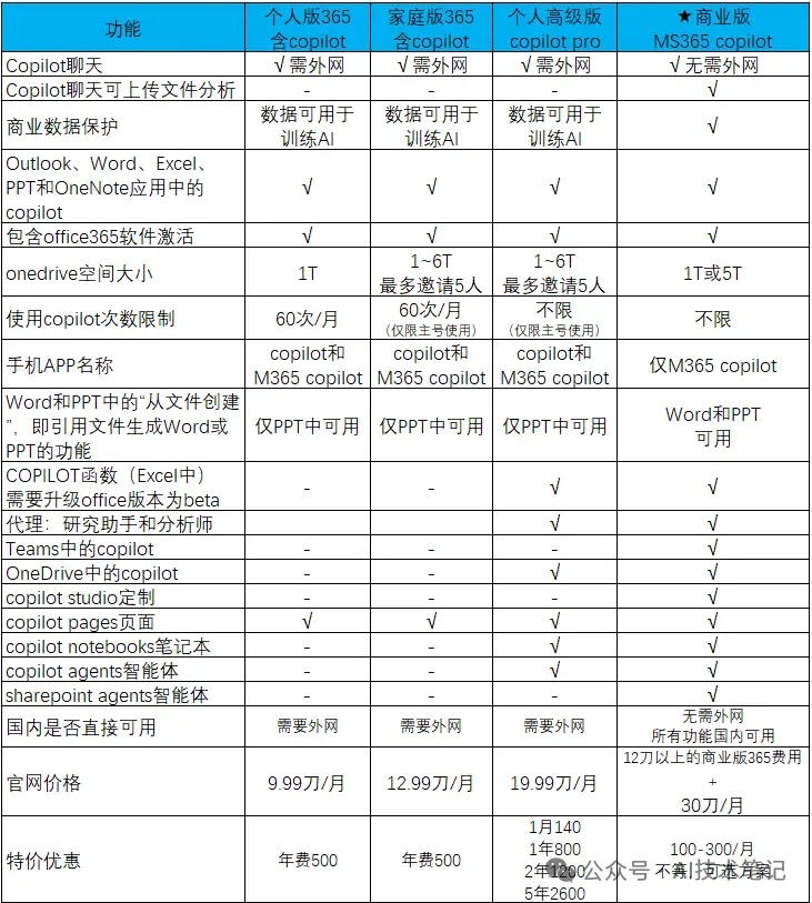 激活office365(可邀请1-5人),每账号1T空间onedrive,激活5台电脑+5台移动设备 在Word、Excel、PPT、OneNote和Outlook桌面应用中内置copilot,无限使用,创建与生成功能国内可用(侧边栏需要科技) 商业版copilot中的 researcher(研究助手)目前也可以在个人高级版中使用