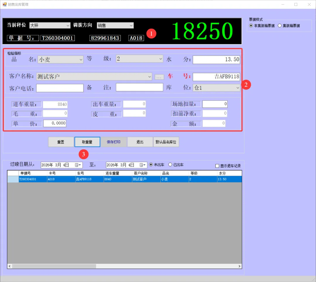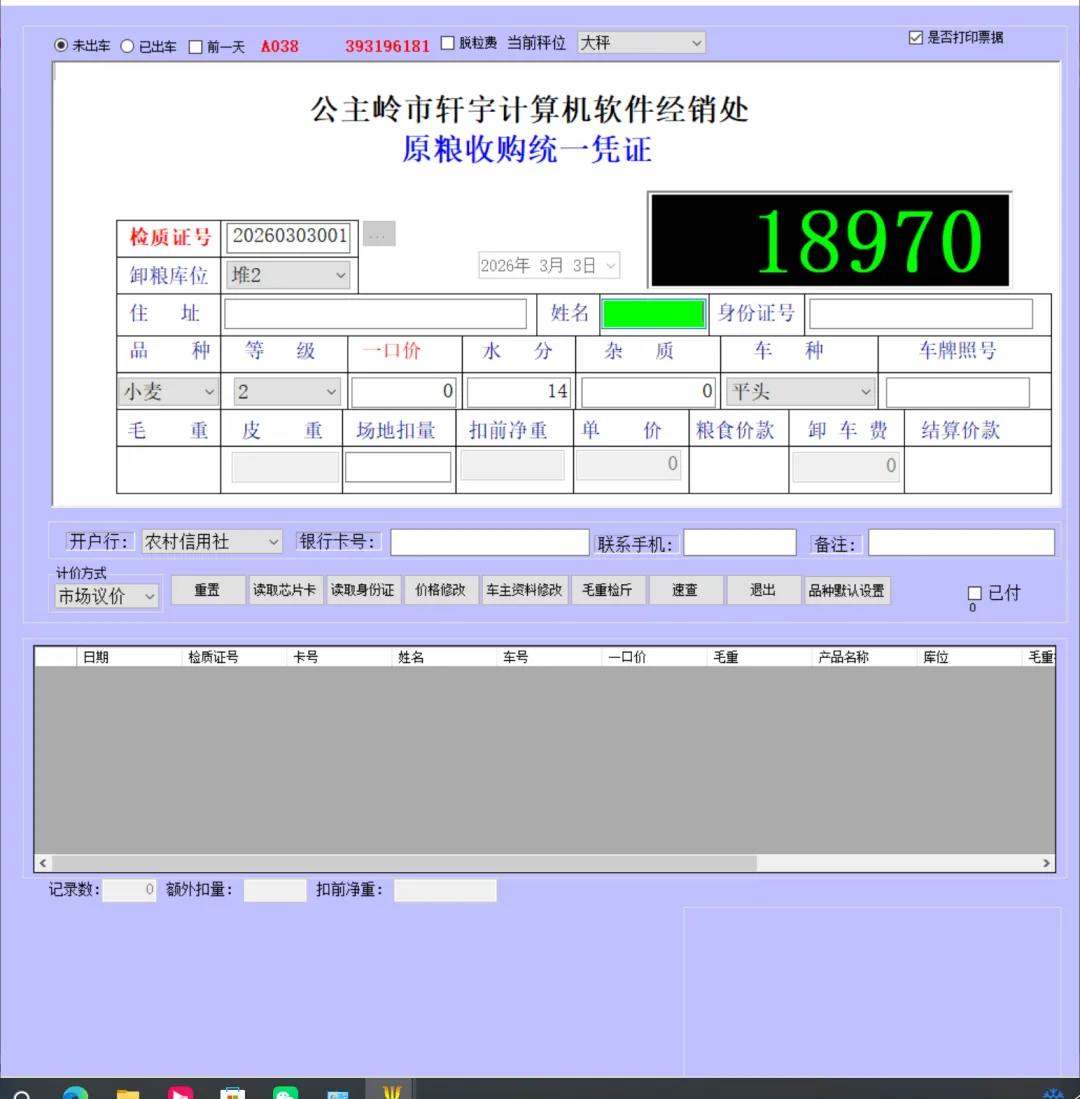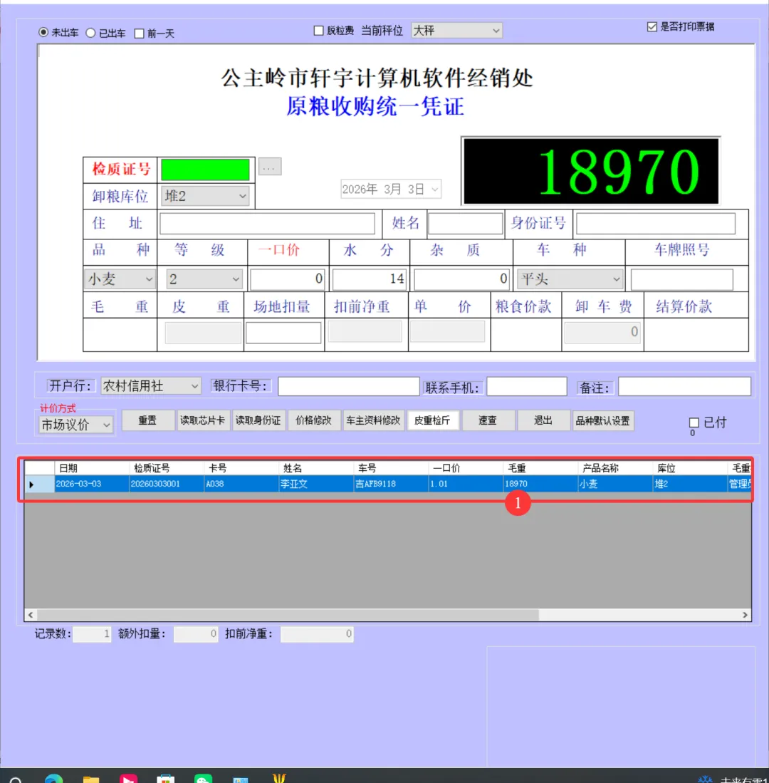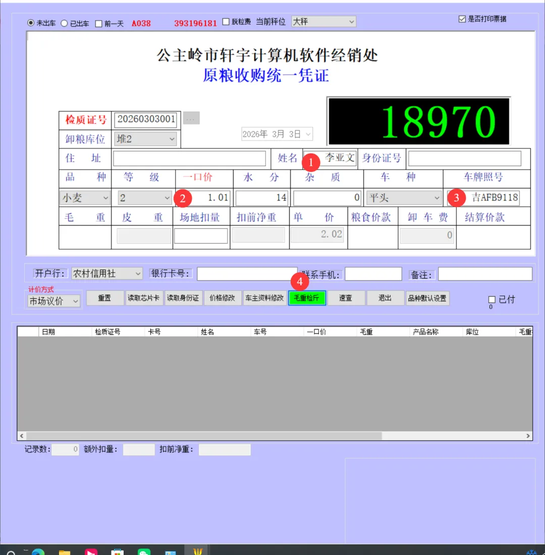 一卡通电脑版(单机版)车辆上秤停稳后将一卡通卡片放置到一卡通读写设备上如下图:生成检质证号20260303001。录入1姓名2一口价3车号(车号不是必填项)。注:姓名、地址、身份证号、银行卡号可以通过设备读取。水分如录实际检验水分,系统可计算当天或累计平均水也可以按系统算出折干量。在上图框1中确认姓名、车号、一口价、毛重信息是刚才录入的信息证明保存成功,将该信息记录到检斤记录本上,可以下秤去场地卸粮。注:如这里没有刚才要保存的信息证明没有保存记录,请核实未保存原因。同样将售粮人手中的一卡通放到一卡通读取设备上如下图:如有场地扣量可在上图2处录入场地扣量(单位公斤),同样确认右上角绿色数据是否与地磅仪表数据一致,如一致点击上图3皮重检斤按钮打印结算单据如下图:空车上秤停稳后,司机下车,秤上数据稳定后,将一卡通放置在读写卡设备上如下图:录入1水分2车号3点取《取重量》按钮,保存皮重数据如下图:如上图录入1客户电话2备注3点击《保存打印》保存皮重信息如下图:将一卡通卡片交给司机,确认数据无误后点击弹出框中的是,确认保存皮重数据。如下图:确认红色框中最上条记录是刚才的车辆的车号、皮重重量无误将数据记录到出库检斤记录本上,车辆可以下称装粮。待重车上秤停稳,司机下秤后,从司机手中接过一卡通卡片放到设备上如下图:核实2框中皮重车辆信息是否与地磅上车辆信息一致,如一致并秤上数据稳定点击取重量。如下图:如上图录入1场地扣量,2单价(价格为吨价)3点击《保存打印》保存毛重信息。如下图:注:还有其它多个报表此处不一一展示,想详细了解可以拨打电话:1594448822 15843456655安装试用版本详细了银