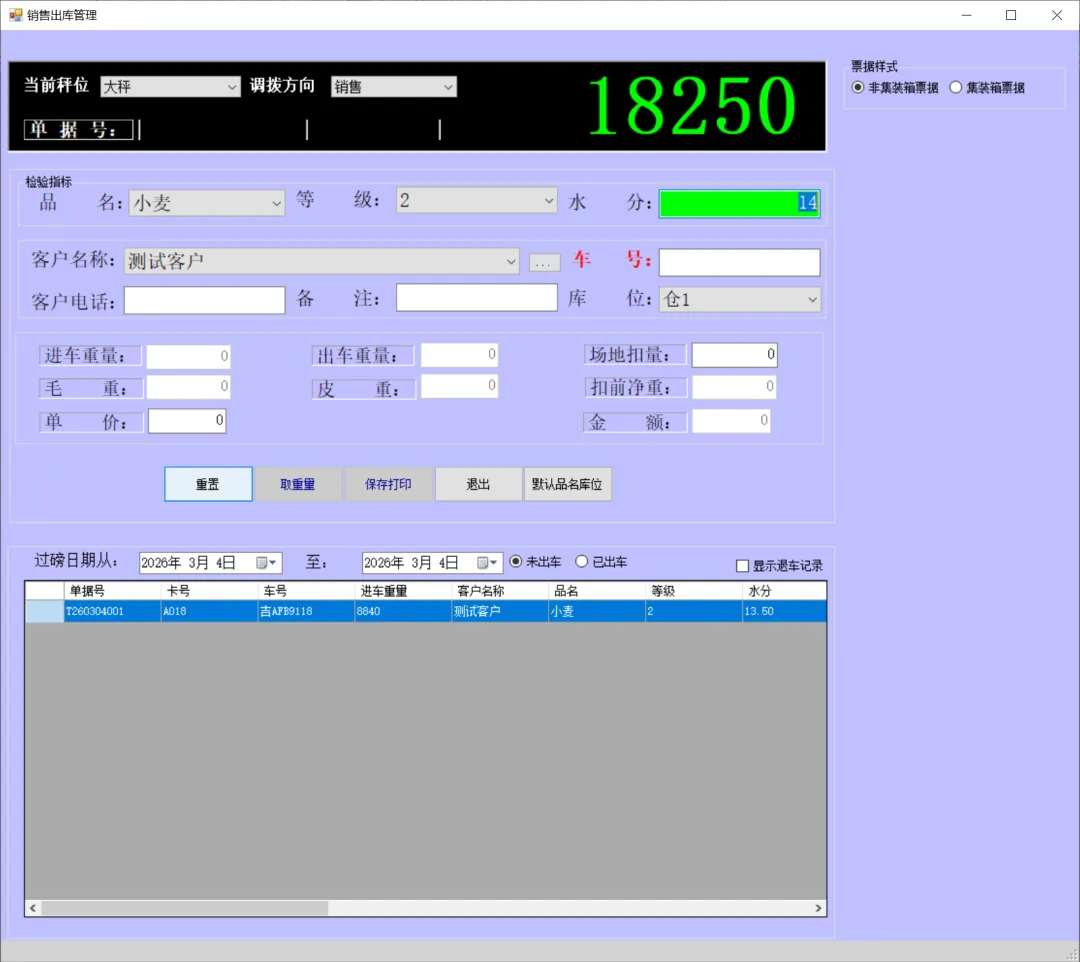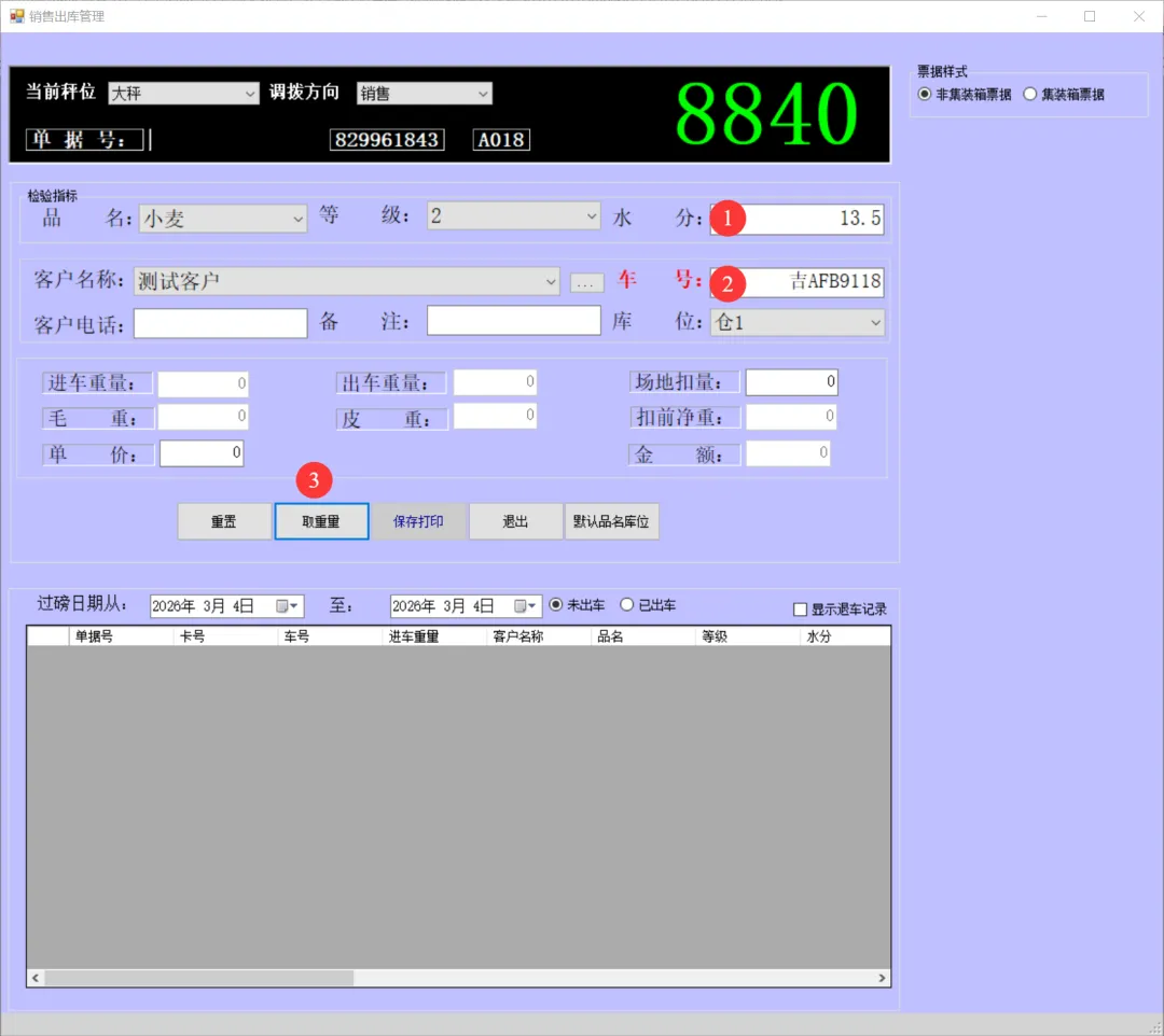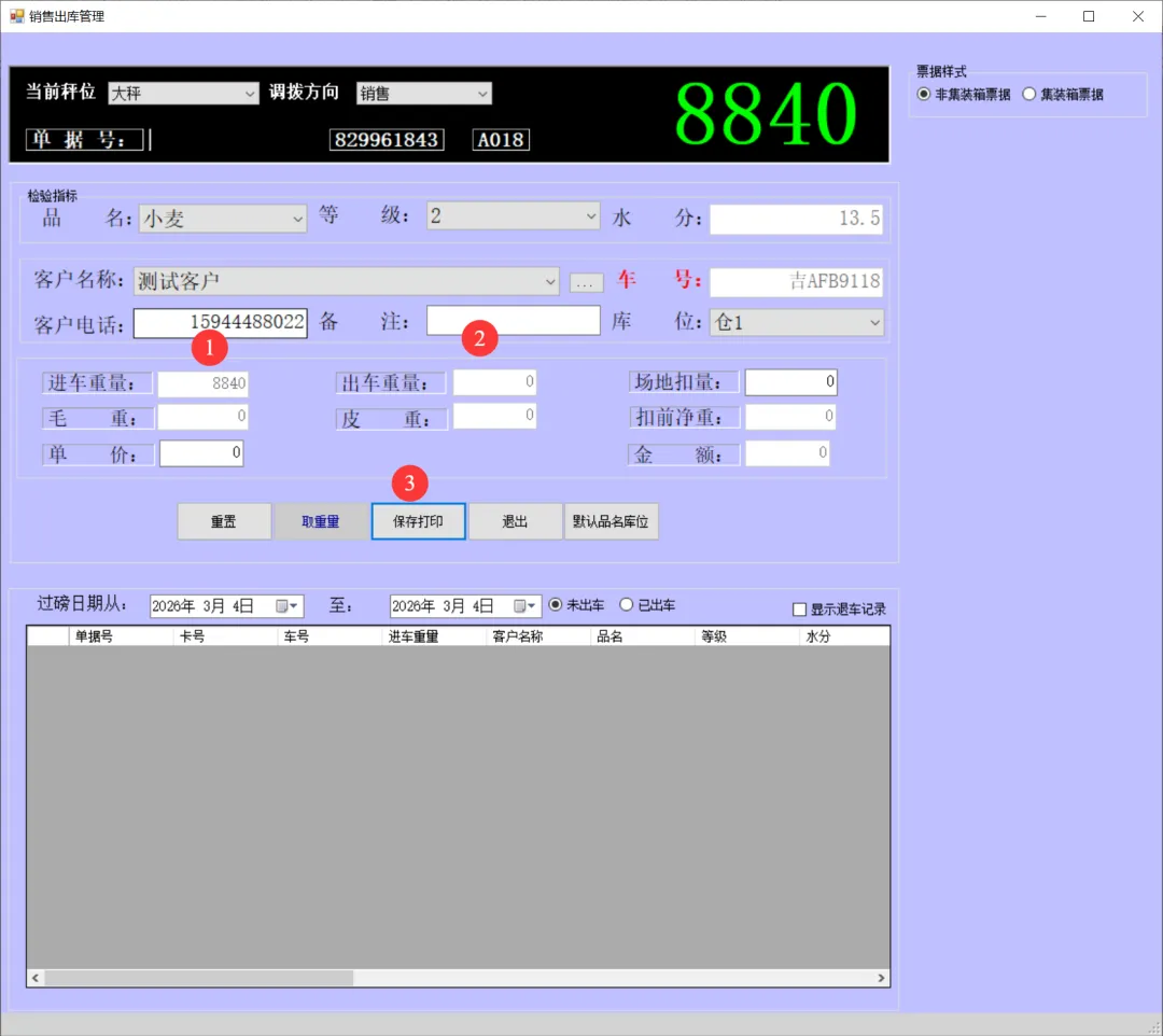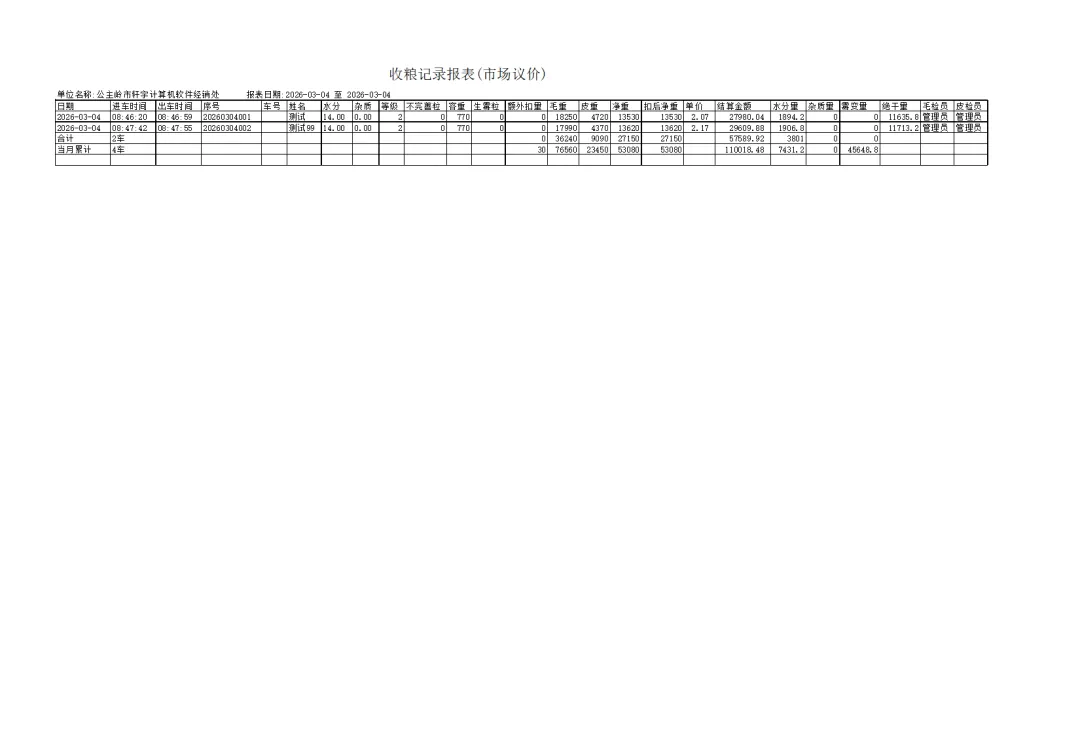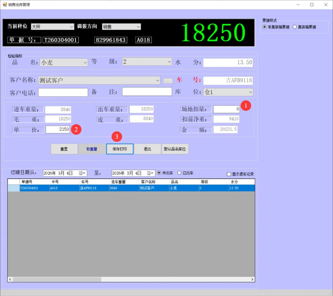 一卡通电脑版(单机版)车辆上秤停稳后将一卡通卡片放置到一卡通读写设备上如下图:生成检质证号20260303001。录入1姓名2一口价3车号(车号不是必填项)。注:姓名、地址、身份证号、银行卡号可以通过设备读取。水分如录实际检验水分,系统可计算当天或累计平均水也可以按系统算出折干量。在上图框1中确认姓名、车号、一口价、毛重信息是刚才录入的信息证明保存成功,将该信息记录到检斤记录本上,可以下秤去场地卸粮。注:如这里没有刚才要保存的信息证明没有保存记录,请核实未保存原因。同样将售粮人手中的一卡通放到一卡通读取设备上如下图:如有场地扣量可在上图2处录入场地扣量(单位公斤),同样确认右上角绿色数据是否与地磅仪表数据一致,如一致点击上图3皮重检斤按钮打印结算单据如下图:空车上秤停稳后,司机下车,秤上数据稳定后,将一卡通放置在读写卡设备上如下图:录入1水分2车号3点取《取重量》按钮,保存皮重数据如下图:如上图录入1客户电话2备注3点击《保存打印》保存皮重信息如下图:将一卡通卡片交给司机,确认数据无误后点击弹出框中的是,确认保存皮重数据。如下图:确认红色框中最上条记录是刚才的车辆的车号、皮重重量无误将数据记录到出库检斤记录本上,车辆可以下称装粮。待重车上秤停稳,司机下秤后,从司机手中接过一卡通卡片放到设备上如下图:核实2框中皮重车辆信息是否与地磅上车辆信息一致,如一致并秤上数据稳定点击取重量。如下图:如上图录入1场地扣量,2单价(价格为吨价)3点击《保存打印》保存毛重信息。如下图:注:还有其它多个报表此处不一一展示,想详细了解可以拨打电话:1594448822 15843456655安装试用版本详细了银