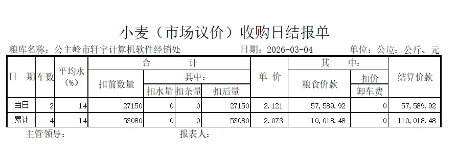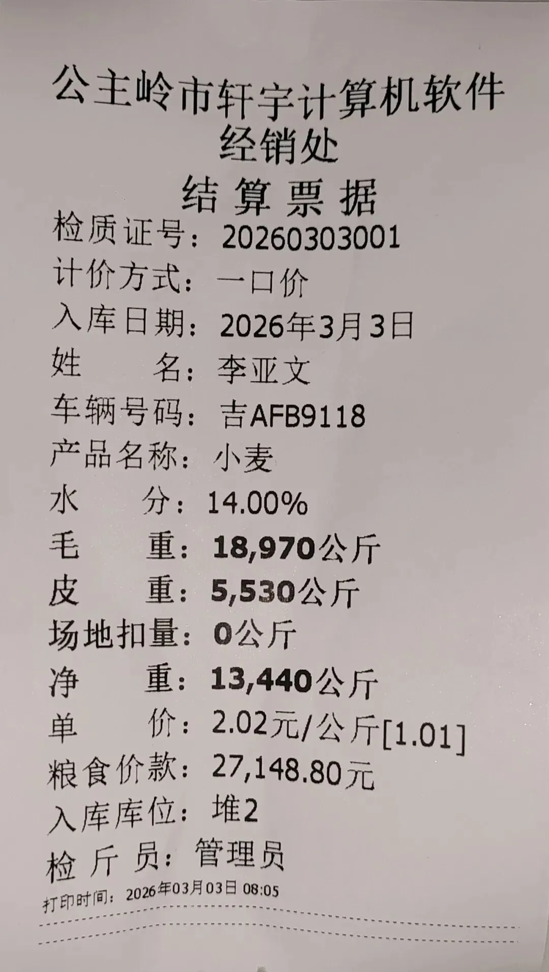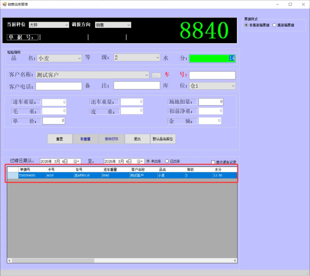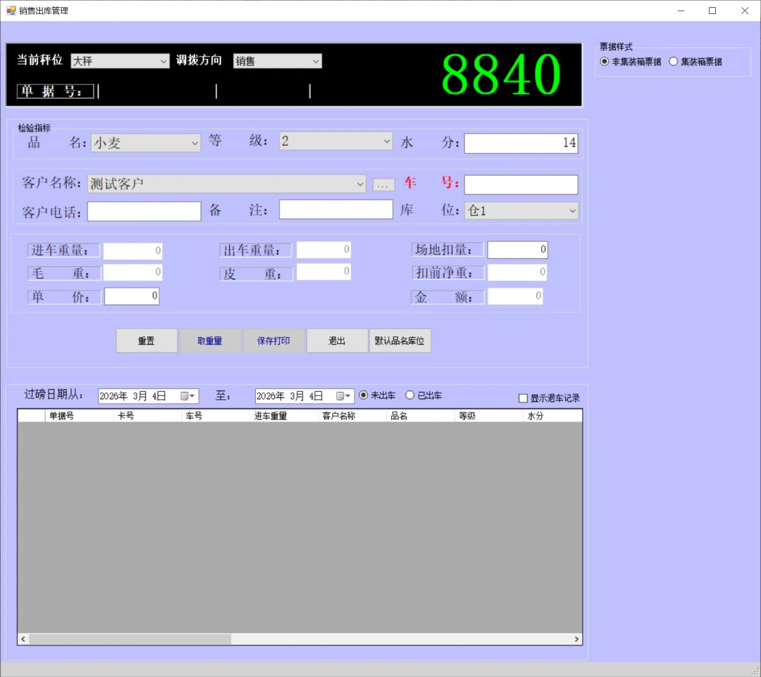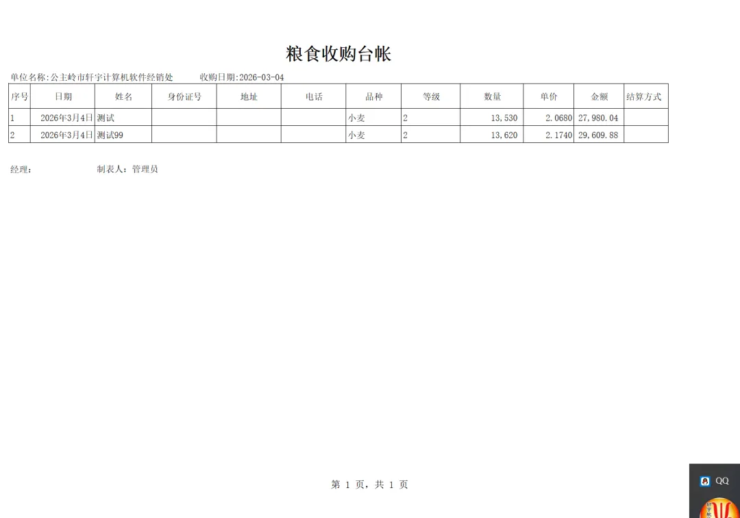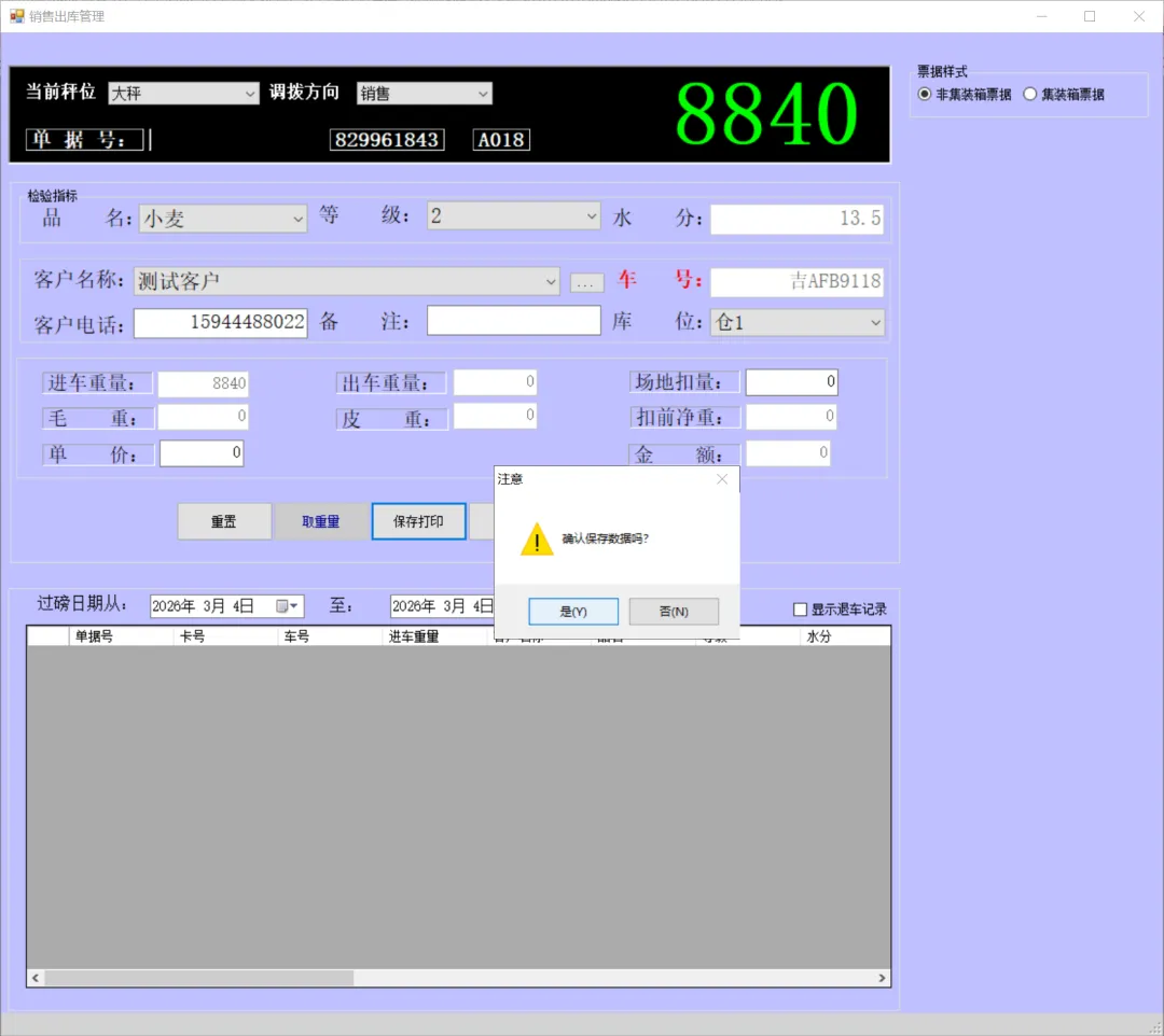 一卡通电脑版(单机版)车辆上秤停稳后将一卡通卡片放置到一卡通读写设备上如下图:生成检质证号20260303001。录入1姓名2一口价3车号(车号不是必填项)。注:姓名、地址、身份证号、银行卡号可以通过设备读取。水分如录实际检验水分,系统可计算当天或累计平均水也可以按系统算出折干量。在上图框1中确认姓名、车号、一口价、毛重信息是刚才录入的信息证明保存成功,将该信息记录到检斤记录本上,可以下秤去场地卸粮。注:如这里没有刚才要保存的信息证明没有保存记录,请核实未保存原因。同样将售粮人手中的一卡通放到一卡通读取设备上如下图:如有场地扣量可在上图2处录入场地扣量(单位公斤),同样确认右上角绿色数据是否与地磅仪表数据一致,如一致点击上图3皮重检斤按钮打印结算单据如下图:空车上秤停稳后,司机下车,秤上数据稳定后,将一卡通放置在读写卡设备上如下图:录入1水分2车号3点取《取重量》按钮,保存皮重数据如下图:如上图录入1客户电话2备注3点击《保存打印》保存皮重信息如下图:将一卡通卡片交给司机,确认数据无误后点击弹出框中的是,确认保存皮重数据。如下图:确认红色框中最上条记录是刚才的车辆的车号、皮重重量无误将数据记录到出库检斤记录本上,车辆可以下称装粮。待重车上秤停稳,司机下秤后,从司机手中接过一卡通卡片放到设备上如下图:核实2框中皮重车辆信息是否与地磅上车辆信息一致,如一致并秤上数据稳定点击取重量。如下图:如上图录入1场地扣量,2单价(价格为吨价)3点击《保存打印》保存毛重信息。如下图:注:还有其它多个报表此处不一一展示,想详细了解可以拨打电话:1594448822 15843456655安装试用版本详细了银