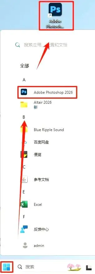 6、从开始菜单将【Adobe Photoshop 2026】拖至桌面,建立快捷方式。