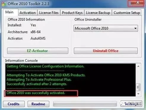 8.在图框中显示“Office 2010 was successfully activated”,Office 2010激活成功