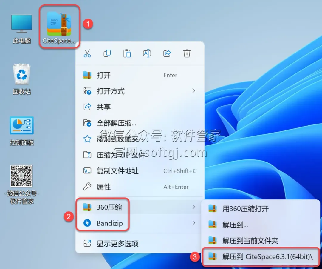 1.解压安装包:①鼠标右击【CiteSpace6.3.1(64bit)】压缩包②选择电脑上安装的解压软件(如:360压缩)③点击【解压到CiteSpace6.3.1(64bit)】。