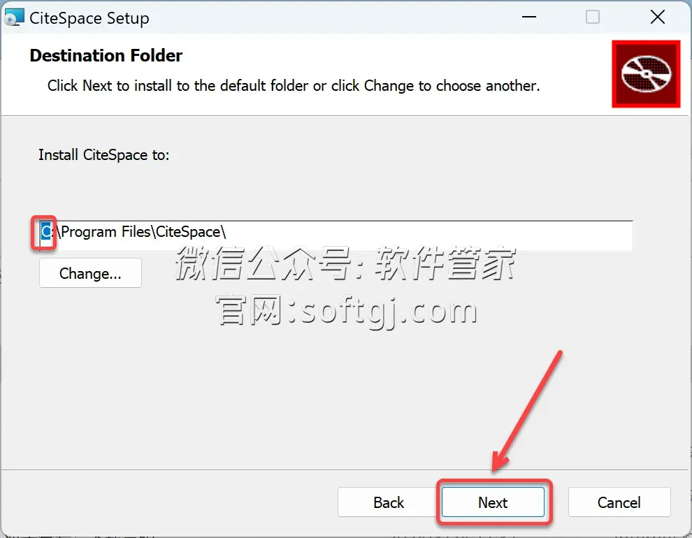 4.修改路径地址中的第一个字符C可更改安装位置(如:把C改为D软件将安装到D盘),点击【Next】。