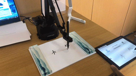 比如这只机械手臂,它的功能就是我在远程的屏幕上画一笔,它跟着画一笔,看起来完完全全是个没什么用的设计嘛!!!